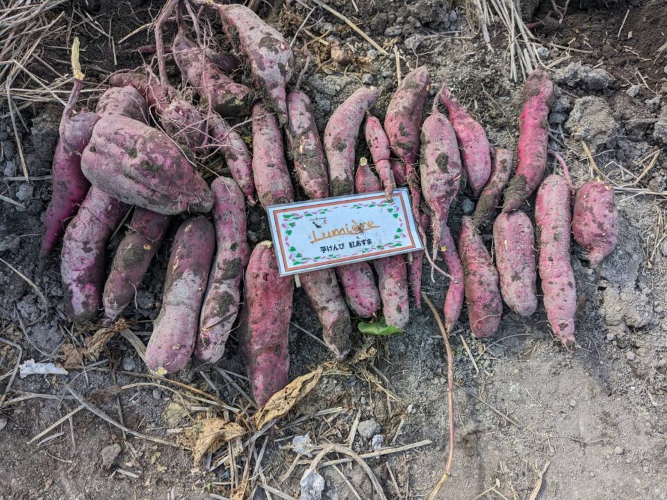 先生も快く引き受けてくださり、今ではルミエルのスタッフや卒業生が一緒に苗植えや収穫をしています。生徒さんたちは「自分たちが育てたお芋が商品になるんだ」と実感して、とても誇らしそうです。